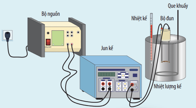 Chuẩn bị: bộ nguồn, jun kế, nhiệt lượng kế và bộ đun, nhiệt kế, que khuấy, dây nối.