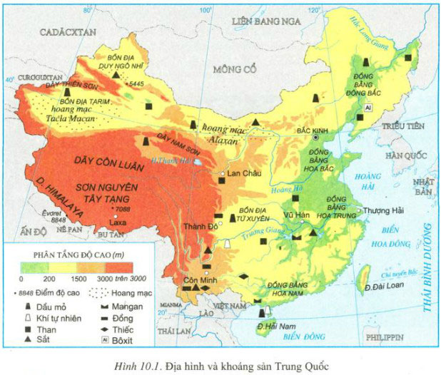 Dựa vào hình 10.1, nêu đặc điểm địa hình của miền Đông và miền Tây Trung Quốc.