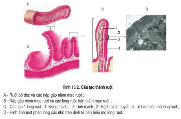 Quan sát hình 15.2, hãy nêu rõ do đâu bề mặt hấp thụ của ruột có thể tăng lên hàng nhìn lần