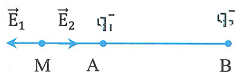 \overrightarrow{E_{1}} = - \overrightarrow{E_{2}}\), mặt khác 2 điện tích điểm trái dấu với nhau nên từ đây suy ra được M phải nằm ngoài đoạn AB (hình vẽ). Ta có: