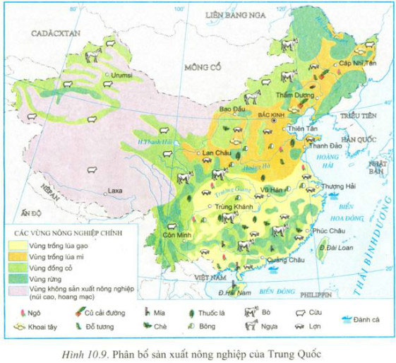 Dựa vào hình 10.9 và kiến thức đã học, nhận xét sự phân bố cây lương thực, cây công nghiệp và một số gia súc của Trung Quốc. Vì sao có sự khác biệt lớn trong phân bố nông nghiệp giữa miền Đông và miền Tây?