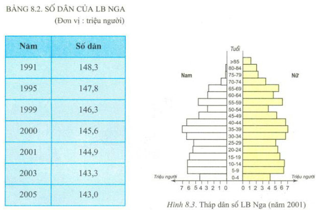 Dựa vào bảng 8.2 và hình 8.3, hãy nhận xét sự thay đổi dân số của LB Nga và nêu hậu quả của sự thay đổi đó.