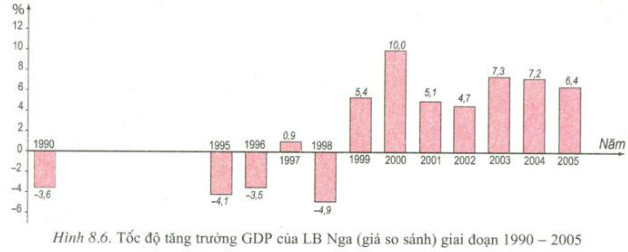 Dựa vào hình 8.6, hãy nhận xét tốc độ tăng trưởng GDP của LB Nga. Nêu những nguyên nhân chủ yếu của sự tăng trưởng đó.