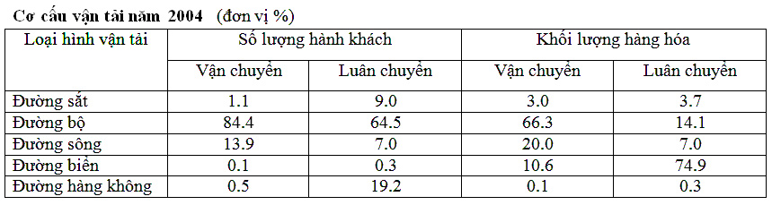 Cho bảng số liệu: Cơ cấu vận tải năm 2004 (trang 136 SGK Địa lí 12)