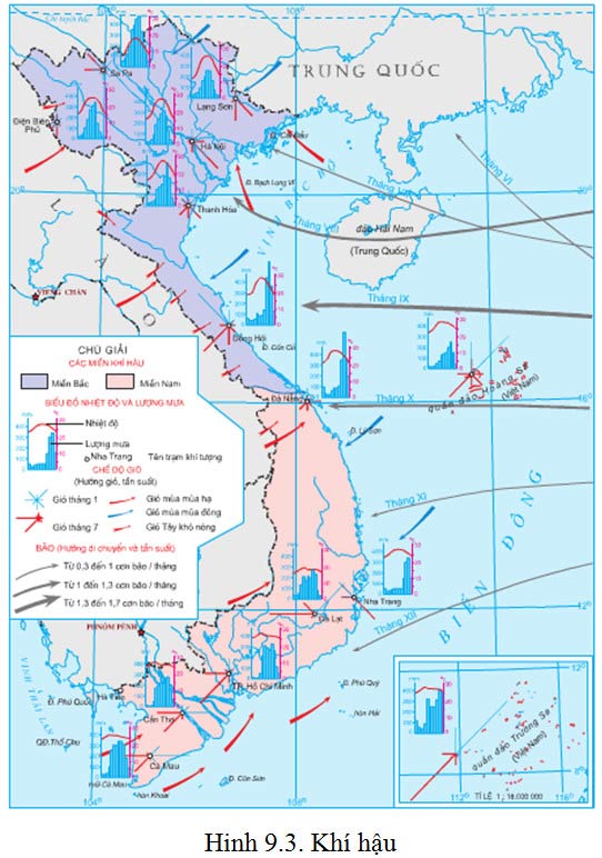 Dựa vào hình 9.3, hãy nhận xét về hướng di chuyển và tần suất của bão vào Việt Nam. Cho biết vùng nào chịu ảnh hưởng nhiều nhất của bão?