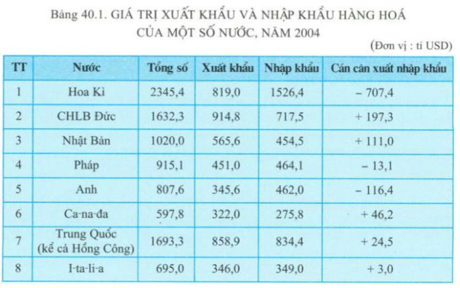 Dựa vào bảng 40.1. em có thể rút ra nhận xét gì về tình hình xuất nhập khẩu của một số nước có nền ngoại thương phát triển hàng đầu trên thế giới năm 2001.