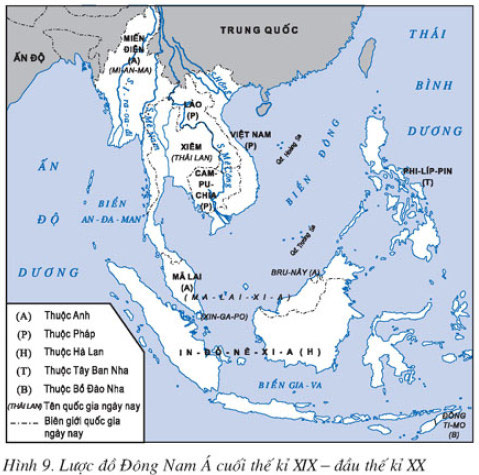 Dựa vào lược đồ (hình 9), trình bày những nét chính về quá trình xâm lược của các nước đế quốc ở Đông Nam Á.