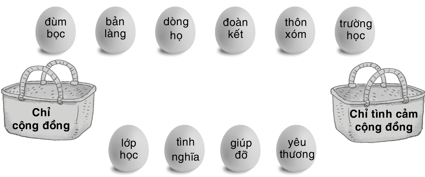Nối các từ ngữ dưới đây vào nhóm thích hợp: từ chỉ cộng đồng - từ chỉ tỉnh cảm cộng đồng
