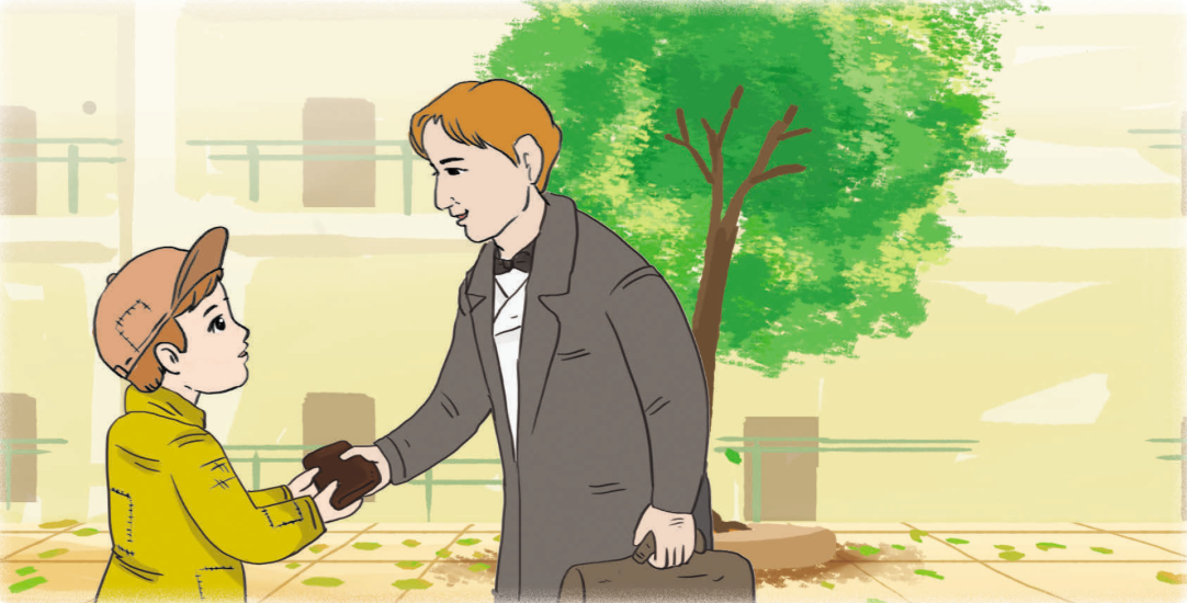Đến nơi, họ thấy một cậu bé với bộ quần áo rách rưới tiến về phía họ. Trên tay cậu ta là chiếc ví của nhà từ thiện. Người trợ lí nhận lại chiếc ví, không quên kiểm tra và thấy ví có rất nhiều tiền.