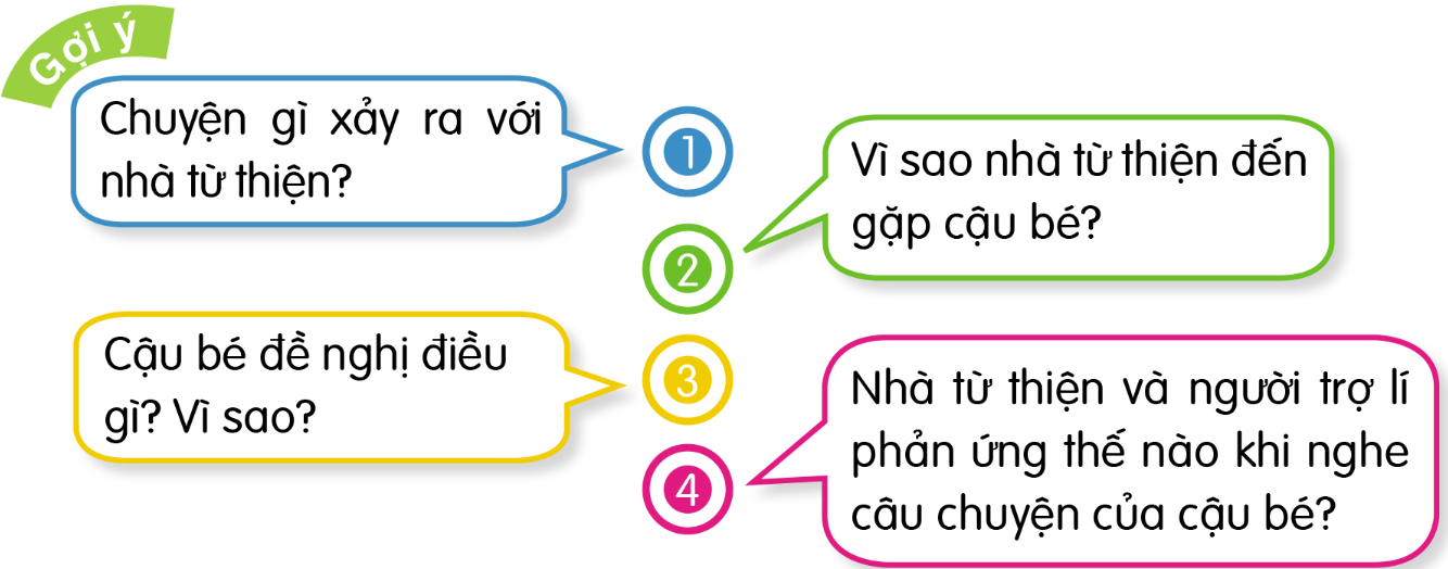 - Em có suy nghĩ gì về tính cách của các nhân vật trong câu chuyện (nhà từ thiện, cậu bé, người trợ lý)?