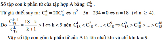 Cho tập hợp A gồm n phần tử (n ≥ 4). Biết rằng số tập con gồm 4 phần tử của A bằng 20 lần số tập con gồm 2 phần tử của A. Tìm k thuộc {1, 2, ..., n} sao cho số tập con gồm k phần tử của A là lớn nhất.