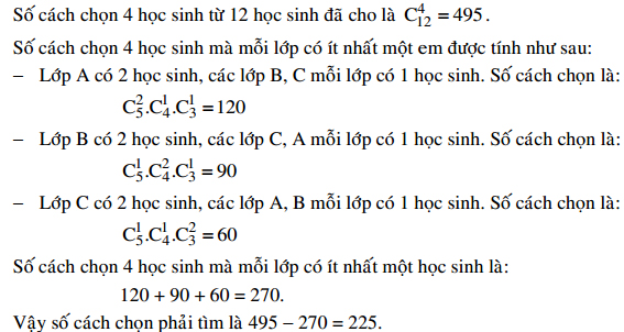 Đội thanh niên xung kích của một trường phổ thông có 12 học sinh, gồm 5 học sinh lớp A, 4 học sinh lớp B và 3 học sinh lớp C. Cần chọn 4 học sinh đi làm nhiệm vụ, sao cho 4 học sinh này thuộc không quá 2 trong 3 lớp trên. Hỏi có bao nhiêu cách chọn như vậy?