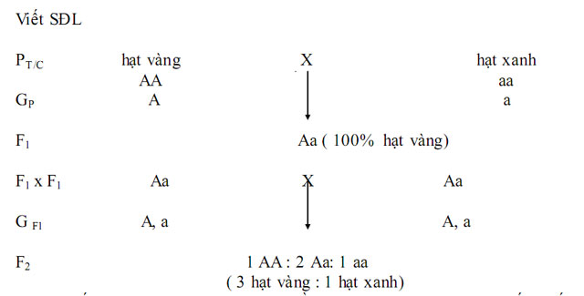 VD1: Tiến hành lai hai giống đậu thuần chủng hạt vàng và hạt xanh, 100%F1 thu được là hạt vàng. Tiếp tục cho F1 lai với nhau. Biện luận và viết SĐL