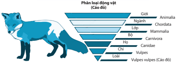 Quan sát sơ đồ các bậc phân loại loài Cáo đỏ trong hình sau và cho biết, tên khoa học của loài Cáo đỏ là gì?