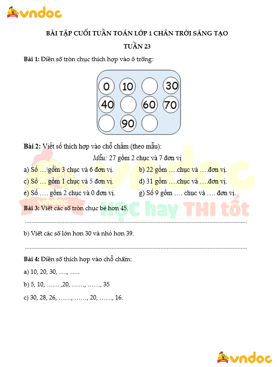 Phiếu bài tập cuối tuần môn Toán lớp 1 Chân trời sáng tạo - Tuần 23