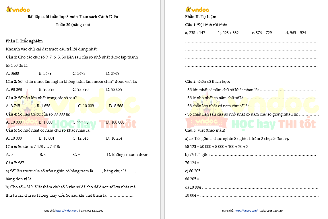 Bài tập cuối tuần Toán lớp 3 Cánh Diều - Tuần 20 (nâng cao) do VnDoc biên soạn nhằm giúp các em học sinh ôn tập, tổng hợp lại kiến thức đã học ở tuần 20 chương trình Toán lớp 3 sách Cánh Diều.