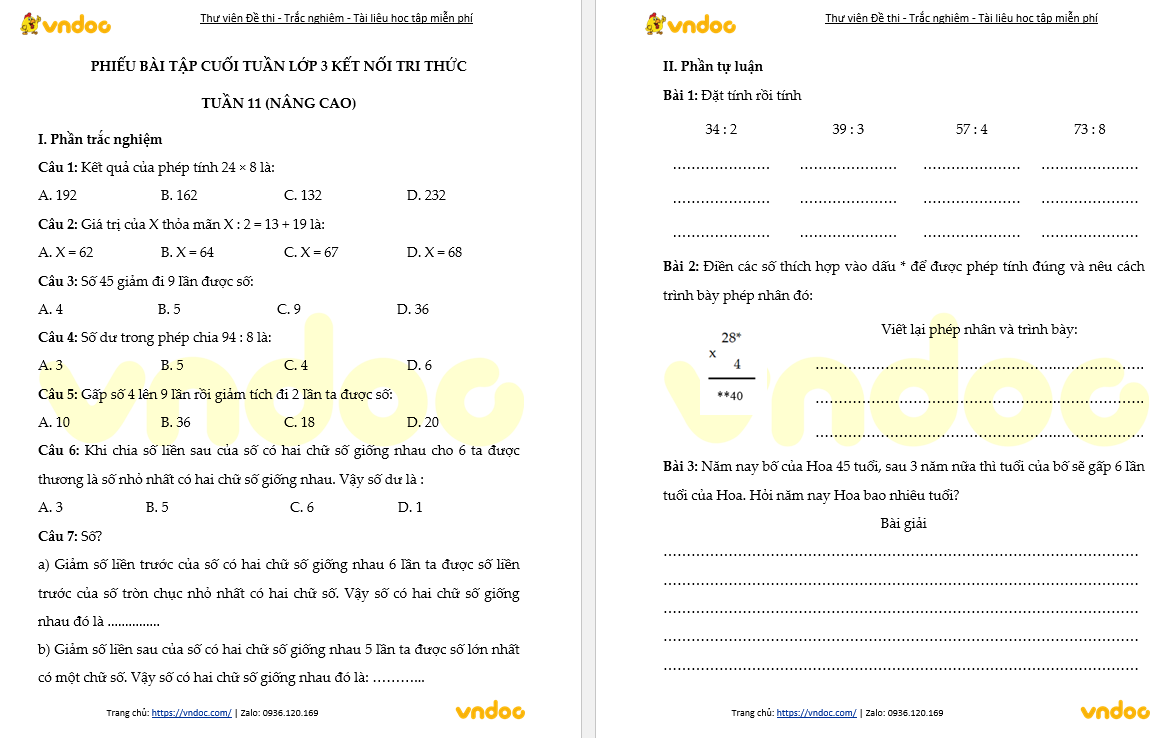 Bài tập cuối tuần Toán lớp 3 Kết nối - Tuần 11 (nâng cao) do VnDoc biên soạn nhằm giúp các em học sinh ôn tập, tổng hợp lại kiến thức đã học ở tuần 11 chương trình Toán lớp 3 sách Kết nối tri thức.