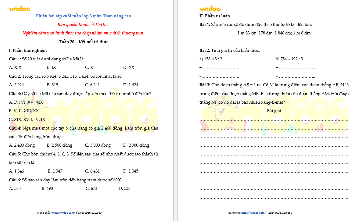 Phiếu bài tập cuối tuần môn Toán nâng cao lớp 3: Tuần 20 do Vndoc biên soạn, bao gồm toàn bộ hệ thống kiến thức môn Toán lớp 3 tuần 20 sách Kết nối cho các em học sinh củng cố, ôn tập, rèn luyện kỹ năng giải Toán lớp 3. Mời các em học sinh cùng các bậc phụ huynh tham khảo.