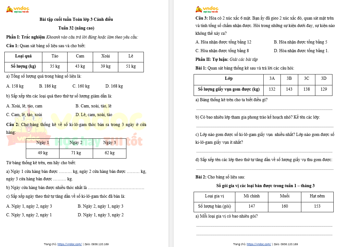 Bài tập cuối tuần Toán lớp 3 Cánh Diều - Tuần 32 (nâng cao) do VnDoc biên soạn nhằm giúp các em học sinh ôn tập, tổng hợp lại kiến thức đã học ở tuần 32 chương trình Toán lớp 3 sách Cánh Diều.