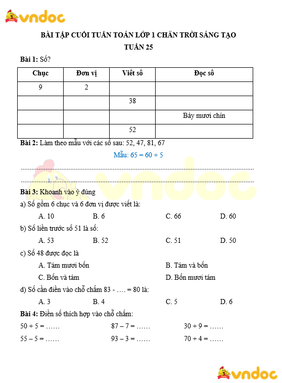 Phiếu bài tập cuối tuần môn Toán lớp 1 Chân trời sáng tạo - Tuần 25