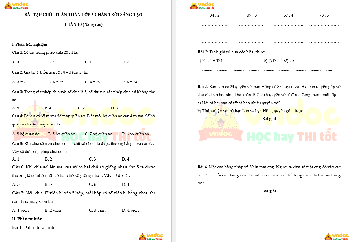 Bài tập cuối tuần Toán lớp 3 Chân trời - Tuần 10 (nâng cao) do VnDoc biên soạn nhằm giúp các em học sinh ôn tập, tổng hợp lại kiến thức đã học ở tuần 10 chương trình Toán lớp 3 sách Chân trời sáng tạo