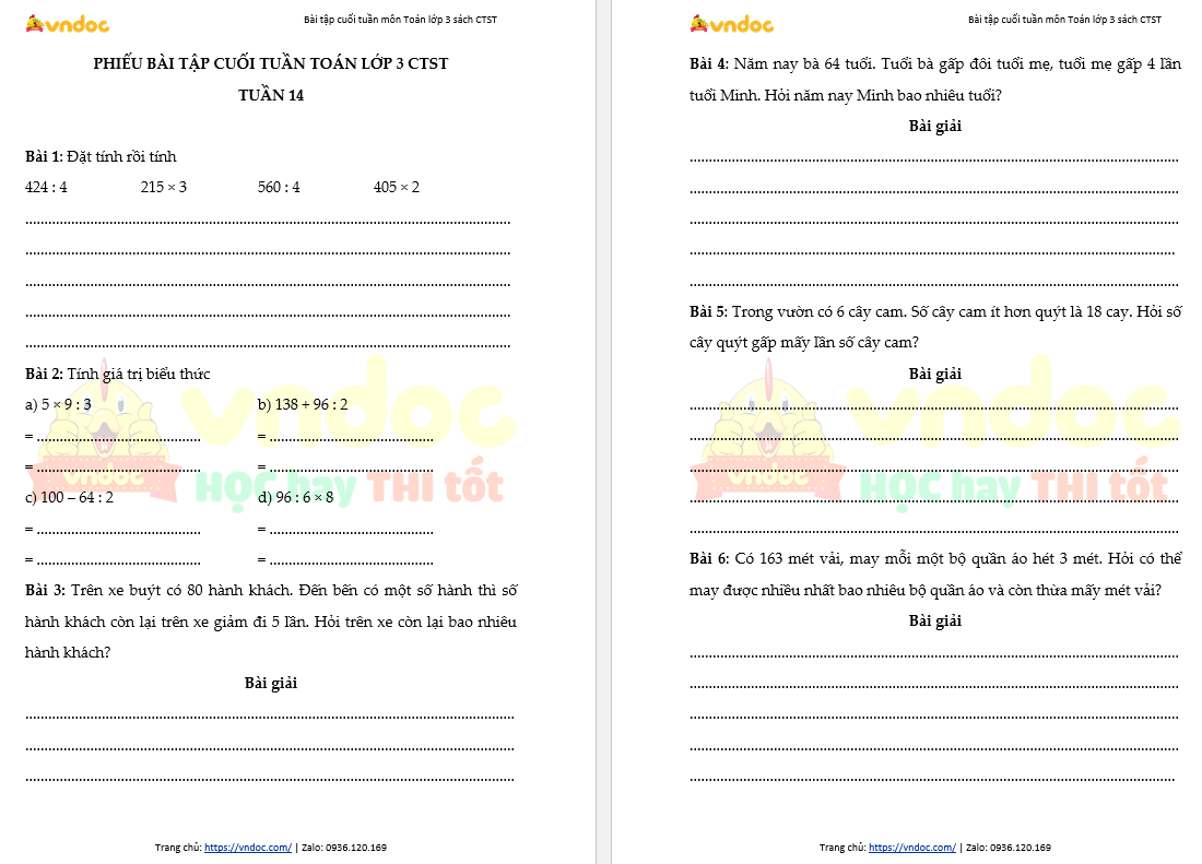 Phiếu bài tập cuối tuần Toán 3: Tuần 14 được VnDoc sưu tầm, tổng hợp cho các thầy cô tham khảo hướng dẫn các em làm bài tập Toán lớp 3, giúp các em học sinh rèn luyện, nâng cao kỹ năng học Toán. Mời các thầy cô tham khảo và tải về chi tiết.