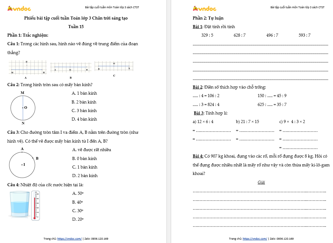 Phiếu bài tập cuối tuần môn Toán lớp 3 Tuần 15