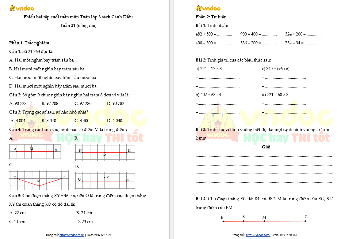 Bài tập cuối tuần Toán lớp 3 Cánh Diều - Tuần 21 (nâng cao) do VnDoc biên soạn nhằm giúp các em học sinh ôn tập, tổng hợp lại kiến thức đã học ở tuần 20chương trình Toán lớp 3 sách Cánh Diều.