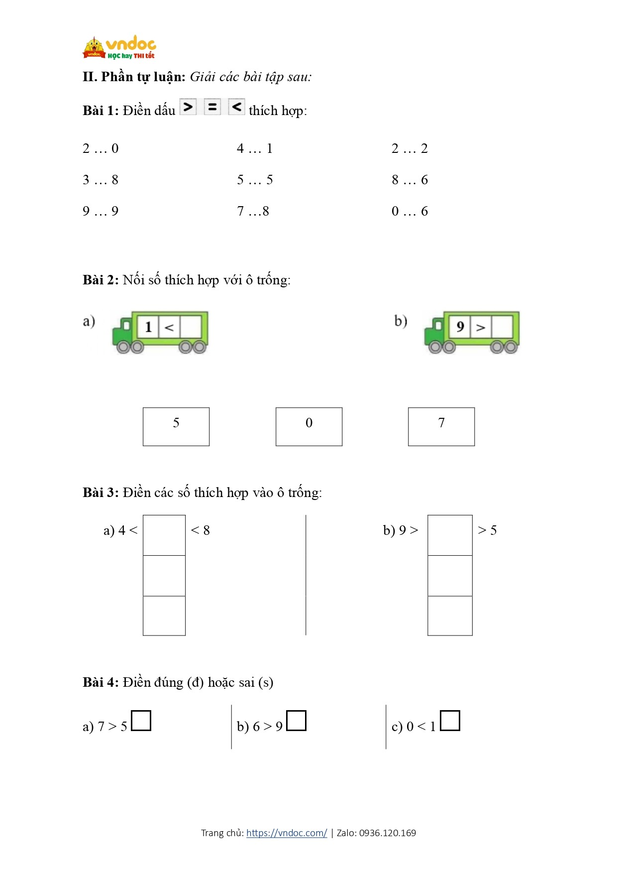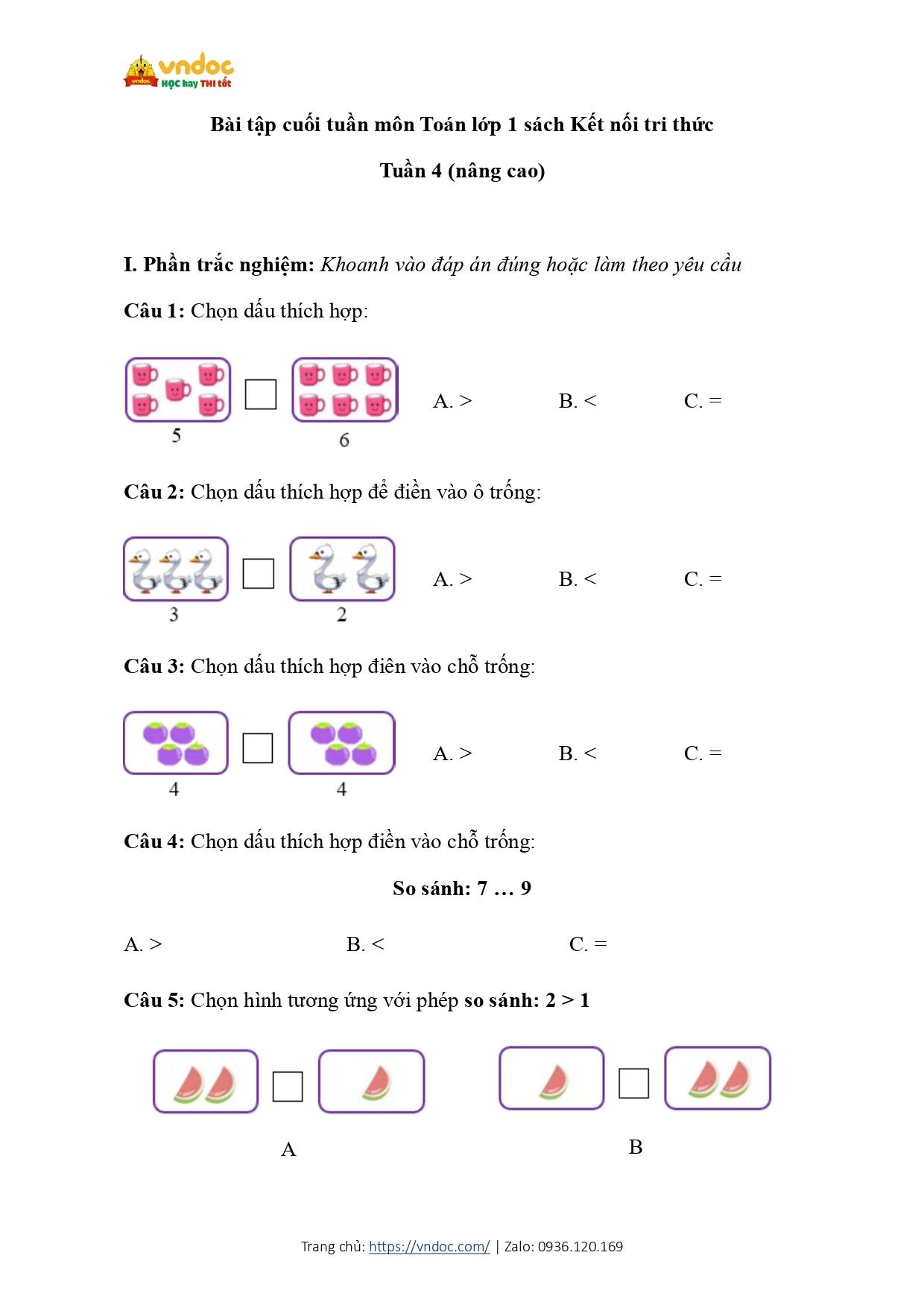 Bài tập cuối tuần Toán lớp 1 Kết nối tri thức (nâng cao) - Tuần 4 do VnDoc biên soạn nhằm giúp các em học sinh ôn tập, tổng hợp lại kiến thức về So sánh, dấu > dấu < dấu = đã học ở tuần 4 chương trình Toán lớp 1 sách Kết nối tri thức với cuộc sống.