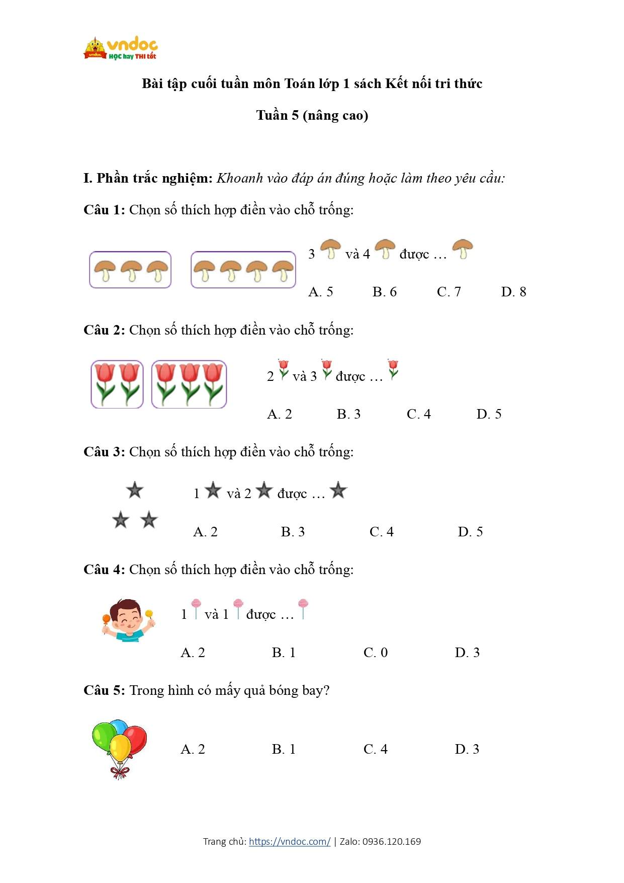Bài tập cuối tuần Toán lớp 1 Kết nối tri thức (nâng cao) - Tuần 5 do VnDoc biên soạn nhằm giúp các em học sinh ôn tập, tổng hợp lại kiến thức về Số tự nhiên; Mấy và mấy đã học ở tuần 5 chương trình Toán lớp 1 sách Kết nối tri thức với cuộc sống.