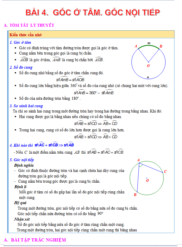 Phiếu bài tập Toán 9 chủ đề Góc ở tâm, góc nội tiếp có đáp án