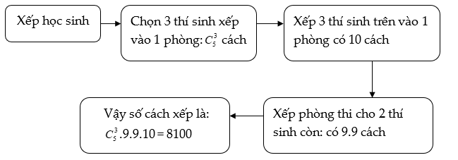 Phân tích: Điều kiện chủ chốt của bài toán này là “3 thí sinh của trường A được xếp vào 1 phòng thi”. Để giải quyết bài toán này thì chúng ta chọn 3 thí sinh sau đó xếp 3 thí sinh này vào 1 phòng thi. Tiếp theo chúng ta sẽ xếp 2 thí sinh còn lại vào các phòng thi khác với phòng thi xếp 3 thí sinh trước.