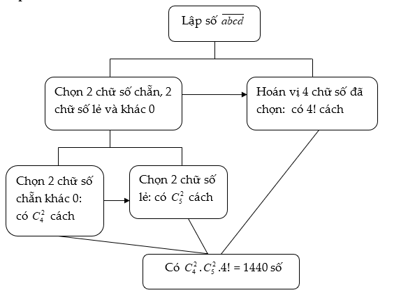 Phân tích: Điều kiện của bài toán là: “4 chữ số” “khác nhau” “khác 0” “có mặt hai chữ số chẵn và hai chữ số lẻ”. Điều kiện: “4 chữ số” “khác nhau” không có gì đáng chú ý. Điều kiện “khác 0” chỉ đơn giản giúp ta không phải nghĩ đến trường hợp rắc rối khi số 0 đứng ở vị trí đầu. Điều kịên chủ chôt trong bài toán là: “có mặt hai chữ số chẵn và hai chữ số lẻ”. Do vậy ta cần chọn trước 2 chữ số chẵn và 2 chữ số lẻ rồi xếp vị trí cho các chữ số đó.
