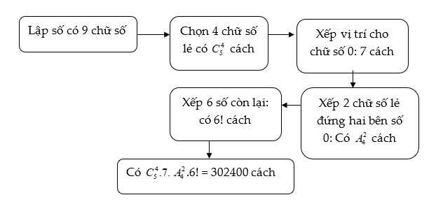 Ví dụ 2: Có bao nhiêu số tự nhiên có 9 chữ số khác nhau mà trong mỗi số có đúng 4 chữ số lẻ và chữ số 0 đứng giữa hai chữ số lẻ (các chữ số liền trước và liền sau của chữ số 0 đều là số lẻ)?