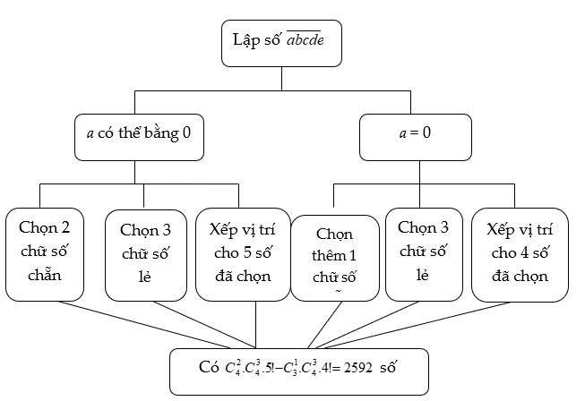 Phân tích: Điều kiện chủ chốt trong bài toán là: “có đúng 2 chữ số chẵn và 3 chữ số lẻ”, ở bài toán này ta dùng phương pháp lấy trước rồi xếp sau. Mặt khác các số đề bài cho có cả số 0 nên ta sử dụng kết hợp thêm phương pháp phần bù: