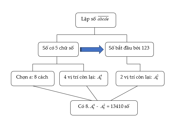 Ví dụ 2: Từ các chữ số 0, 1, 2, 3, 4, 5, 6, 7, 8 có thể lập được bao nhiêu số tự nhiên gồm 5 chữ số đôi một khác nhau và không bắt đầu bởi 123?