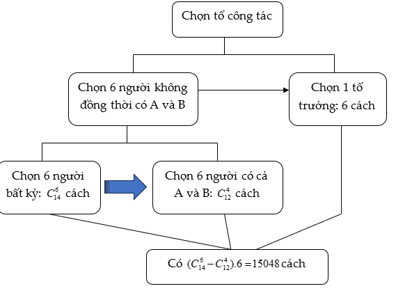 Ví dụ 3: Từ một tập thể 14 người gồm 6 nam và 8 nữ trong đó có A và B, người ta muốn chọn một tổ công tác gồm 6 người. Tìm số cách chọn trong mỗi trường hợp sau: