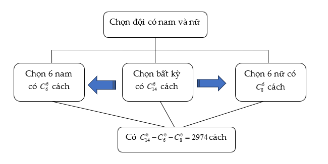 Với ý a, để đếm trực tiếp số cách chọn tổ có cả nam và nữ thì ta phải xây dựng được một sơ đồ công việc để chọn một tổ có cả nam và nữ. chẳng hạn như: Bước1: chọn một bạn nam, bước 2: chọn một bạn nữ, bước 3: chọn 4 bạn còn lại. Cách chọn trên đảm bảo điều kiện có “cả nam và nữ” tuy nhiên lại không thể dùng để đếm được vì hai cách chọn khác nhau lại cho cùng một đội. Vì vậy để giải quyết bài toán này ta dùng phương pháp đếm phần bù của trường hợp cần đếm là các trường hợp “6 người toàn nam” và “6 người toàn nữ”.