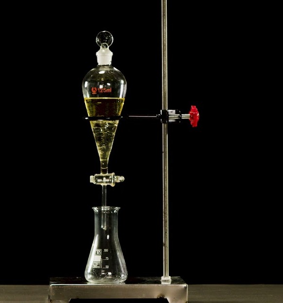 Bước 3: Sau đó từ từ mở khóa phễu chiết để thu lần lượt từng lớp chất lỏng.
