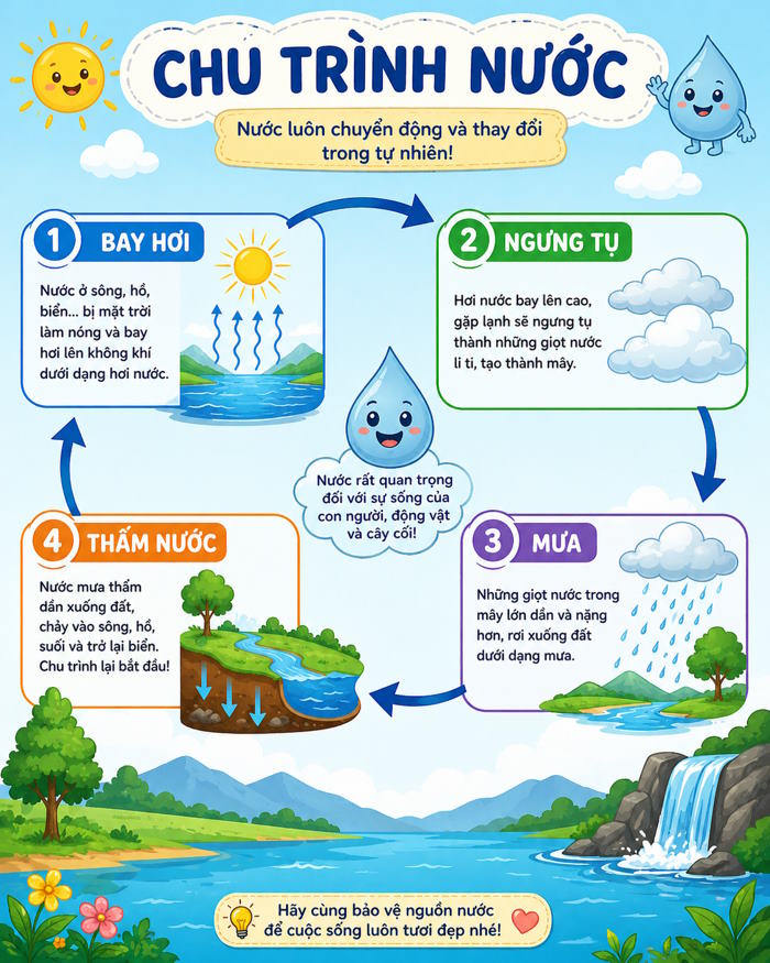 “Tạo infographic tiếng Việt về ‘Chu trình nước’ cho học sinh lớp 4, gồm 4 bước: bay hơi, ngưng tụ, mưa, thấm nước, có mũi tên minh họa, màu sắc tươi sáng, chữ rõ ràng dễ đọc”