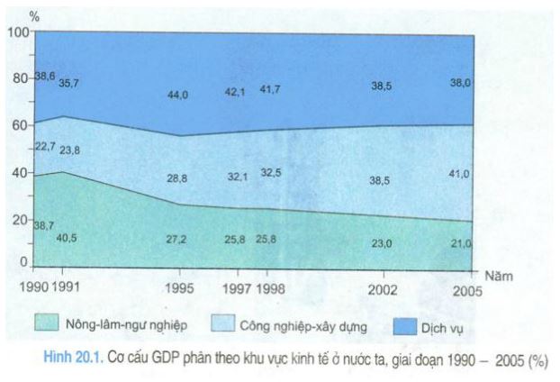 Quan sát hình 20.1, phân tích sự chuyển dịch cơ cấu GDP phân theo khu vực kinh tế ở nước ta, giai đoạn 1990 – 2005
