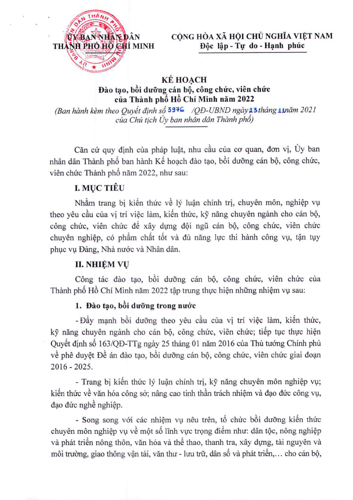 VnDoc mời các bạn cùng theo dõi nội dung chi tiết của Quyết định 3976/QĐ-UBND TP.HCM 2021 về kế hoạch đào tạo, bồi dưỡng cán bộ, công chức năm 2022 trong bài viết dưới đây.
