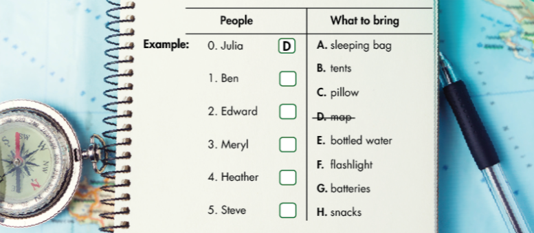 You will hear some information about a camping trip. What will each person bring? For each question, write a letter (A–H) next to each person. You will hear the conversation twice. Bạn sẽ nghe thông tin về buổi cắm trại. Mọi người sẽ mang những gì. Với mỗi câu hỏi, viết các chứ cái A- H cho mỗi người. Bạn sẽ nghe đoạn hội thoại hai lần.