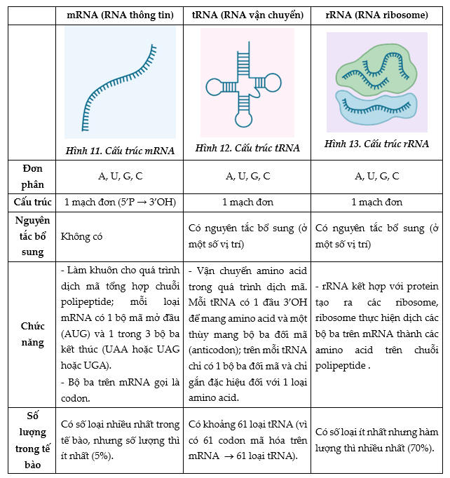 - Ngoài 3 loại RNA “kinh điển” là mRNA (RNA thông tin), tRNA (RNA vận chuyển) và rRNA (RNA ribosome), sinh vật còn có nhiều loại RNA khác với chức năng điều hòa, xúc tác và sửa đổi gen.