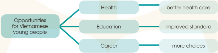 3. Write a paragraph (120-150 words) about the benefits young Vietnamese people have gained since Viet Nam joined different international organisations. You can use the suggested ideas below. Viết đoạn văn (120-150 từ) kể về những lợi ích mà thanh niên Việt Nam đã đạt được kể từ khi Việt Nam tham gia các tổ chức quốc tế khác nhau. Bạn có thể sử dụng các ý tưởng gợi ý bên dưới.