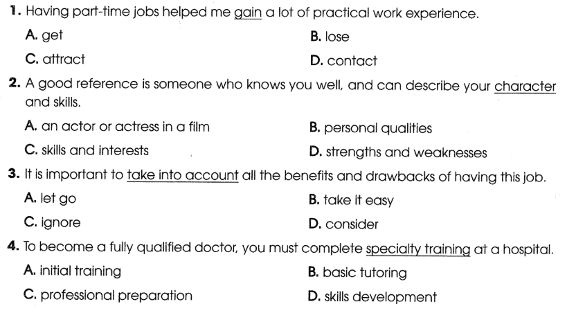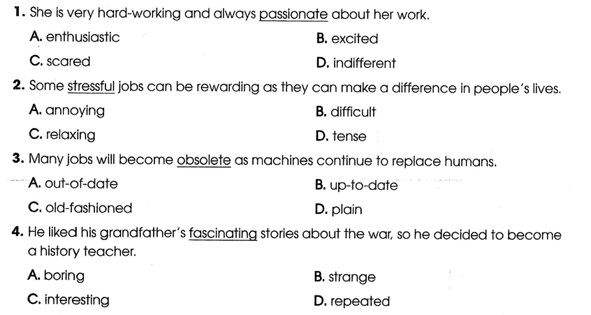 2 Circle the letter A, B, C, or D to indicate the word(s) CLOSEST in meaning to the underlined word(s) in each of the following questions. Khoanh tròn chữ cái A, B, C hoặc D để chỉ ra (các) từ GẦN NGHĨA NHẤT với (các) từ được gạch chân trong mỗi câu hỏi sau đây.