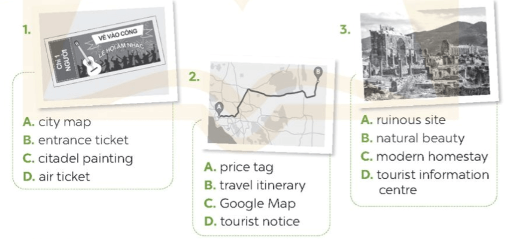 1. Circle the correct answer A, B, C, or D to match each picture. (Khoanh tròn vào câu trả lời đúng A, B, C hoặc D tương ứng với mỗi bức tranh.)
