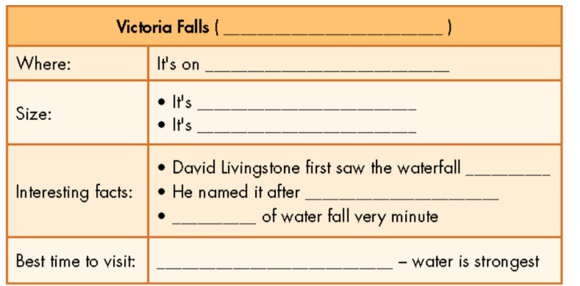 (trang 37 SBT Tiếng Anh 9 Smart World): Now, write a paragraph about Victoria Falls. Use the Writing Skill box, the reading model, and your planning notes to help. Write 100 to 120 words. (Bây giờ, hãy viết một đoạn văn về Thác Victoria. Sử dụng hộp Kỹ năng Viết, mẫu bài đọc và ghi chú lập kế hoạch của bạn để trợ giúp. Viết 100 đến 120 từ.)
