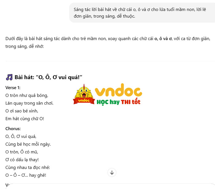 Ví dụ: Sáng tác lời bài hát về chữ cái o, ô và ơ cho lứa tuổi mầm non, lời lẽ đơn giản, trong sáng, dễ thuộc.