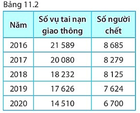 Dựa vào Bảng 11.2, hãy vẽ đồ thị biểu diễn sự thay đổi về số vụ tai nạn giao thông hằng năm trong bảng thống kê của Ủy ban An toàn giao thông Quốc gia. Trục tung biểu diễn số vụ tai nạn được làm tròn tới hàng trăm (theo nguyên tắc từ 50 trở lên coi là 100, dưới 50 coi là 0). Trục hoành biểu diễn thời gian theo đơn vị năm.